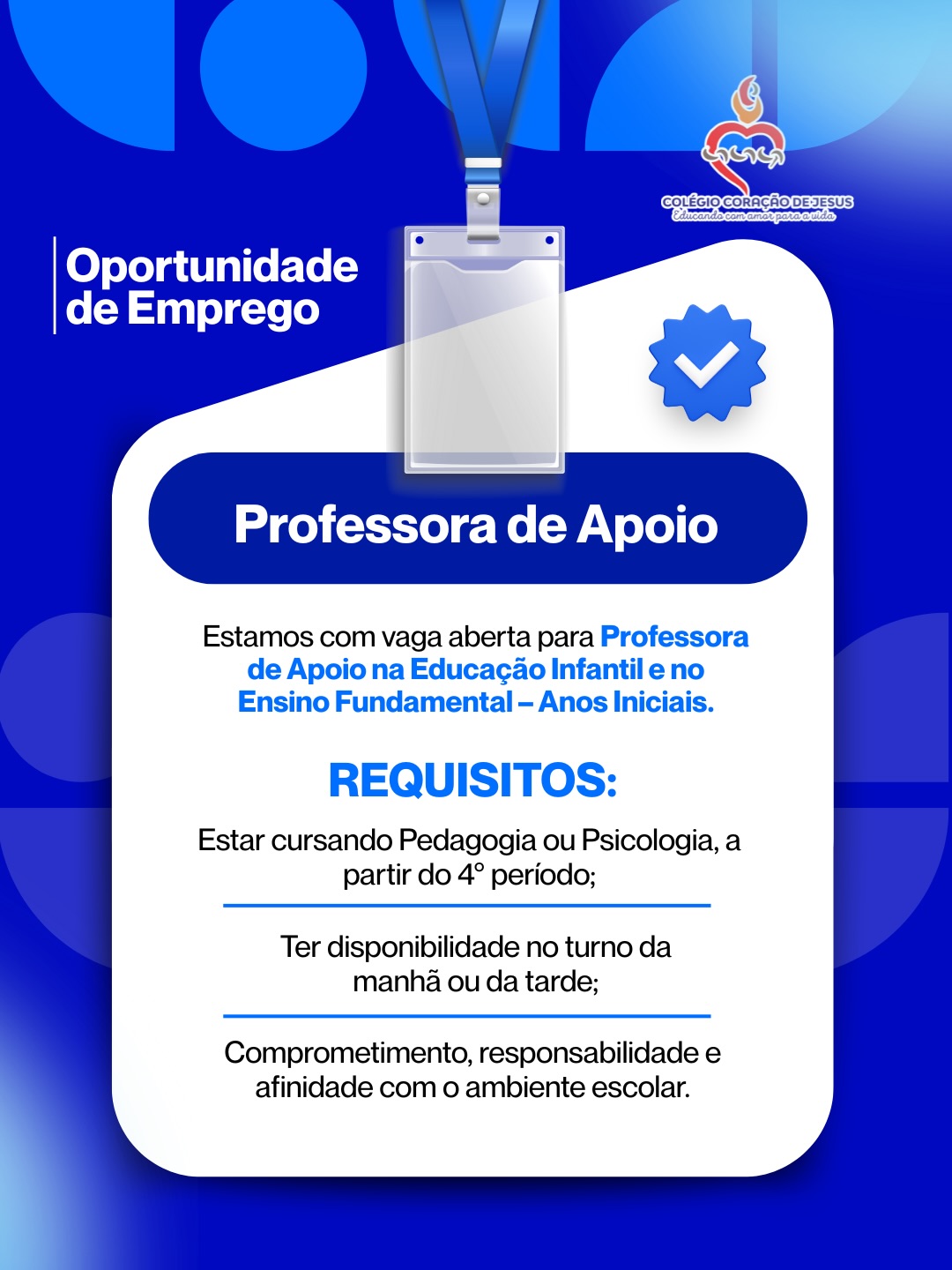 Estamos com vaga aberta para Professora de Apoio na Educação Infantil e no Ensino Fundamental – Anos Iniciais! 👇